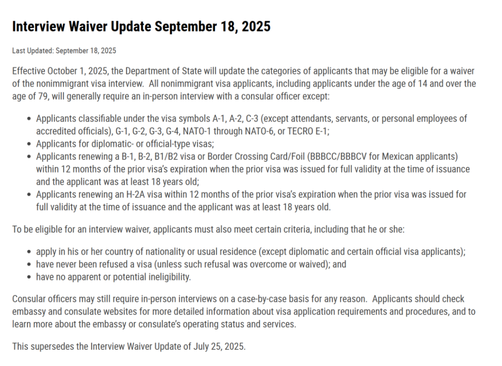 从 2025年10月起,美国国务院调整签证面谈豁免政策: