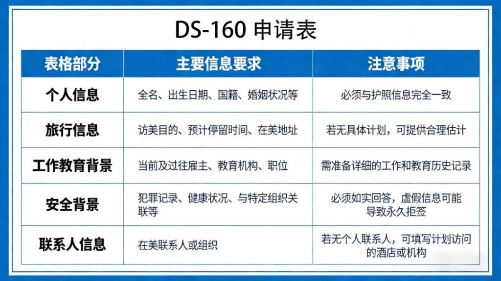 表格内容涵盖个人信息、旅行计划、工作教育背景等多方面。填写时需提供准确信息,因为任何不实陈述都可能导致签证被拒或未来移民申请受影响。